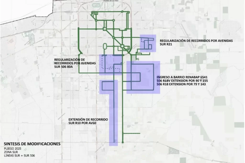 La línea Sur buscará darle cobertura a áreas densamente pobladas que hoy se encuentran con una cobertura ineficiente. Los recorridos por la avenida 60 llegarán a la ruta 36; se formalizarán recorridos a los barrios registrados en el RENABAP; la línea 506 tendrá una nueva traza; y también se mejorarán los recorridos dentro de Altos de San Lorenzo.